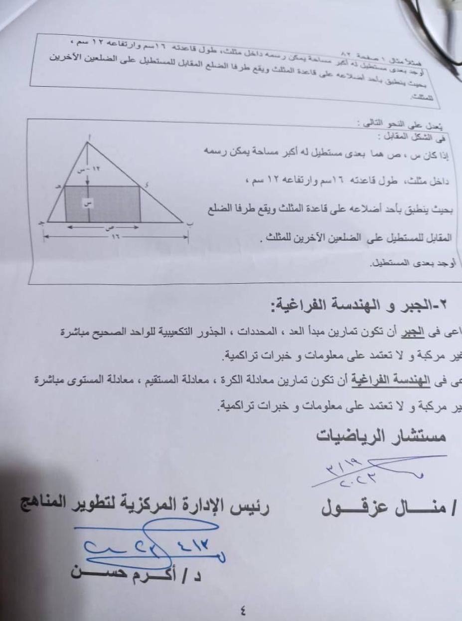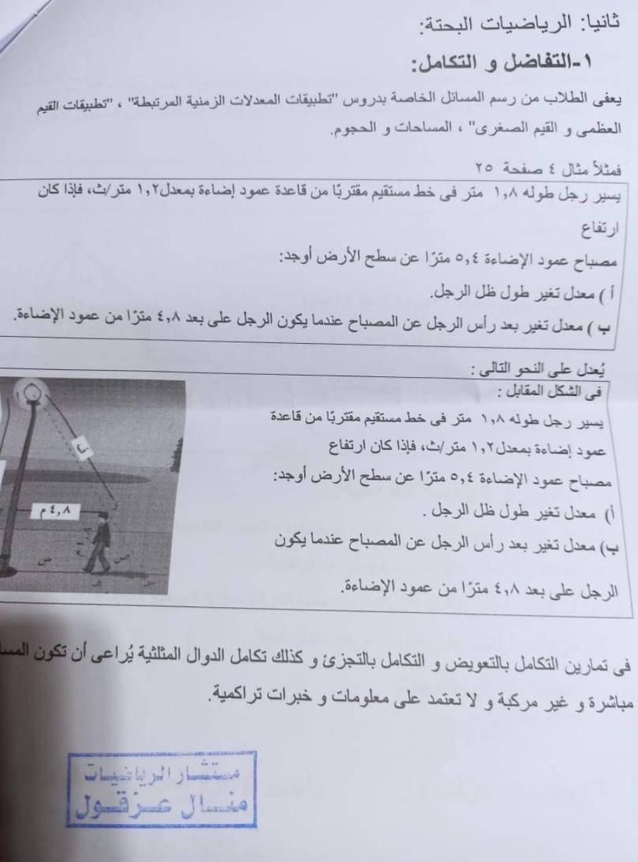 -التفاضل والتكامل: يعفى الطلاب من رسم المسائل الخاصة بدروس تطبيقات المعدلات الزمنية المرتبطة وتطبيقات العظمى والقيم الصغرى والمساحات والحجوم.