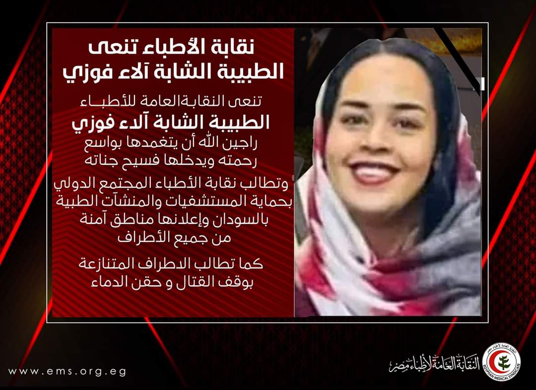 نعت النقابة العامة للأطباء الطبيبة الشابة آلاء فوزي، حيث طالبت النقابة المجتمع الدولي بحماية المستشفيات والمنشآت الطبية بالسودان وإعلانها مناطق آمنة من جميع الأطراف.