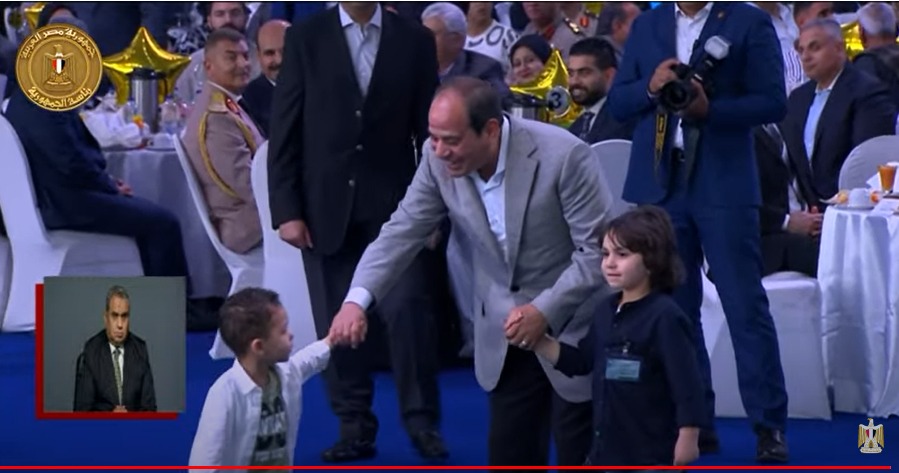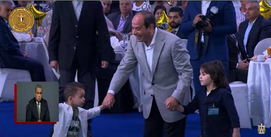 تجول الرئيس عبد الفتاح السيسي، رئيس الجمهورية، في قاعة مركز المنارة، حيث إقامة احتفالية، عيد الفطر المبارك، رفقة طفلين، واضعًا يده في أيديهم.