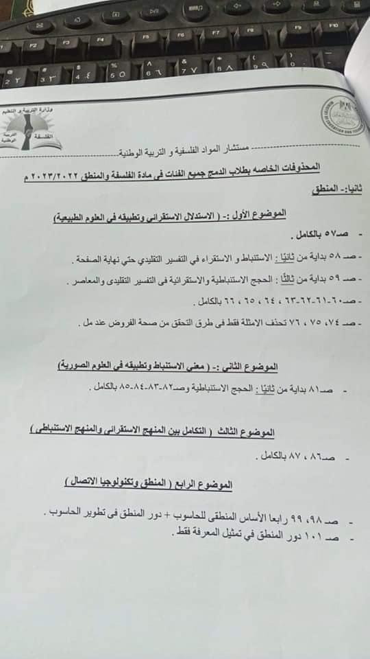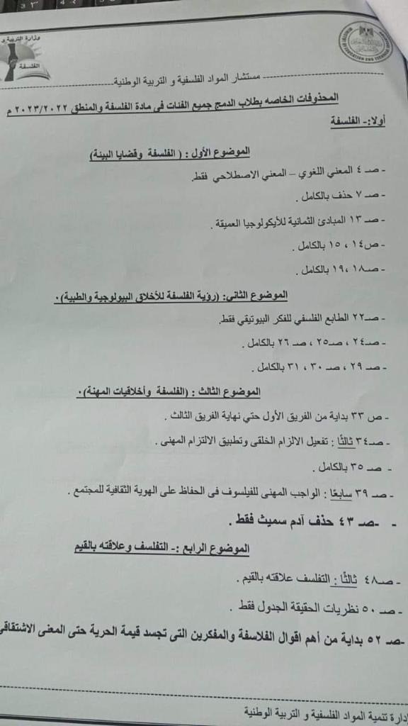 المحذوفات الخاصة بطلاب الدمج في مادة الفلسفة والمنطق 2023