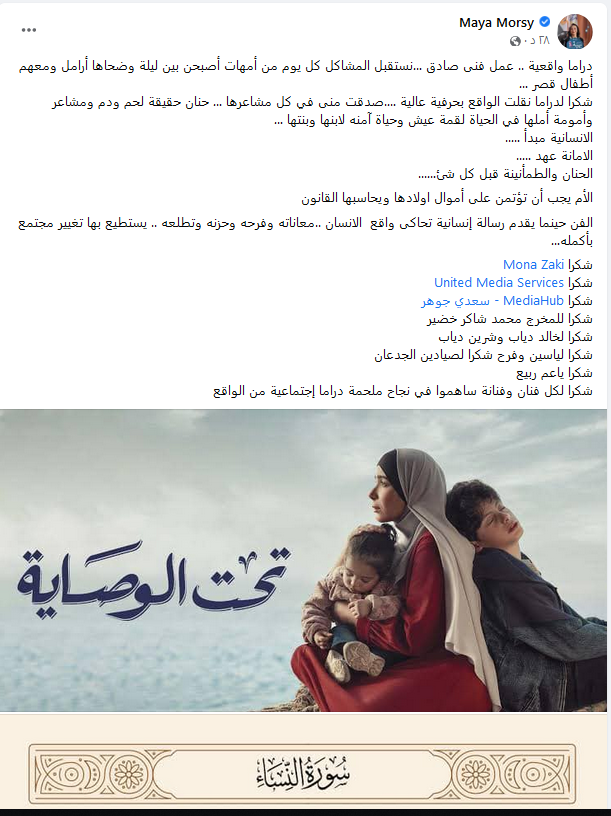 وأضافت مايا مرسي، خلال منشور لها عبر فيسبوك: نستقبل المشاكل كل يوم من أمهات أصبحن بين ليلة وضحاها أرامل ومعهم أطفال قصر، فشكرا لدراما نقلت الواقع بحرفية عالية، وصدقت منى في كل مشاعرها.. حنان حقيقة لحم ودم ومشاعر وأمومة أملها في الحياة لقمة عيش وحياة آمنه لابنها وبنتها.
