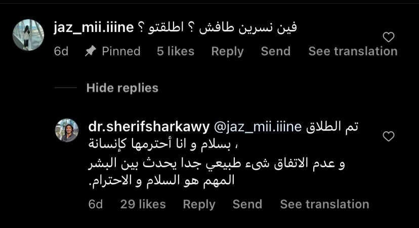 بينما علق طبيب الأسنان شريف شرقاوي عبر حسابه الشخصي على موقع تبادل الصور والفيديوهات إنستجرام، على نبأ انفصاله عن الفنانة السورية نسرين طافش، وأوضح: تم الطلاق بسلام وأنا أحترمها كإنسانة وعدم الاتفاق شيء طبيعي يحدث بين البشر المهم هو السلام والاحترام.