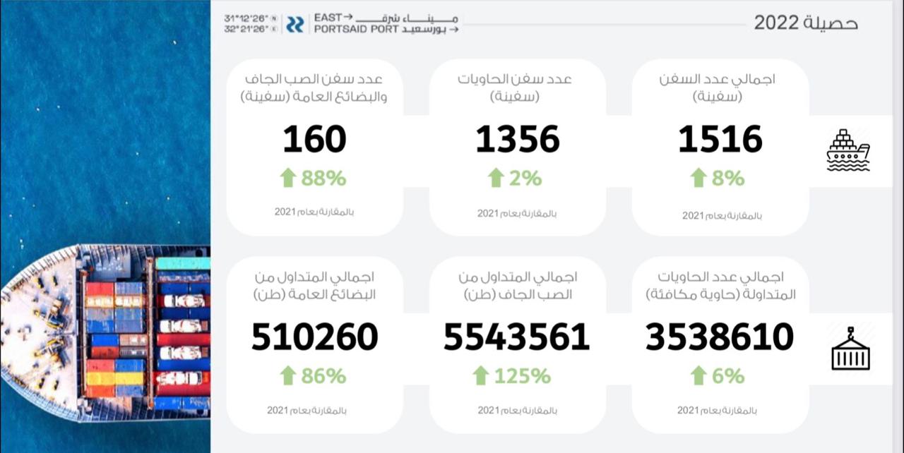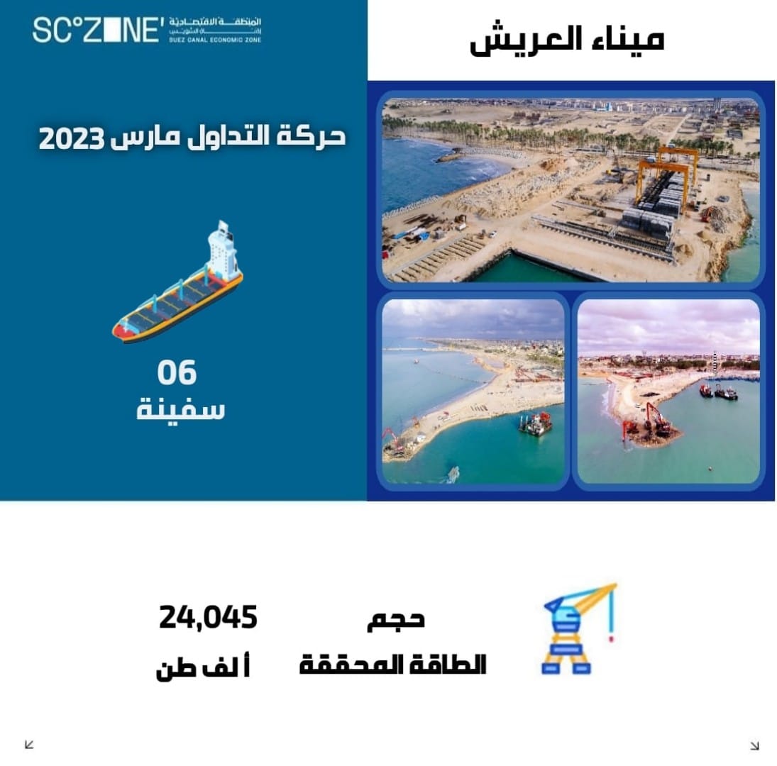 وعن حركة التداول بميناء العريش لعام 2022، أعلنت الهيئة، أنه استقبل 86 سفينة خلال عام 2022 لتصدير بضائع الصب للأسواق الخارجية بطاقة محققة بلغت 336،416 ألف طن بزيادة 32 سفينة عن عام 2021.