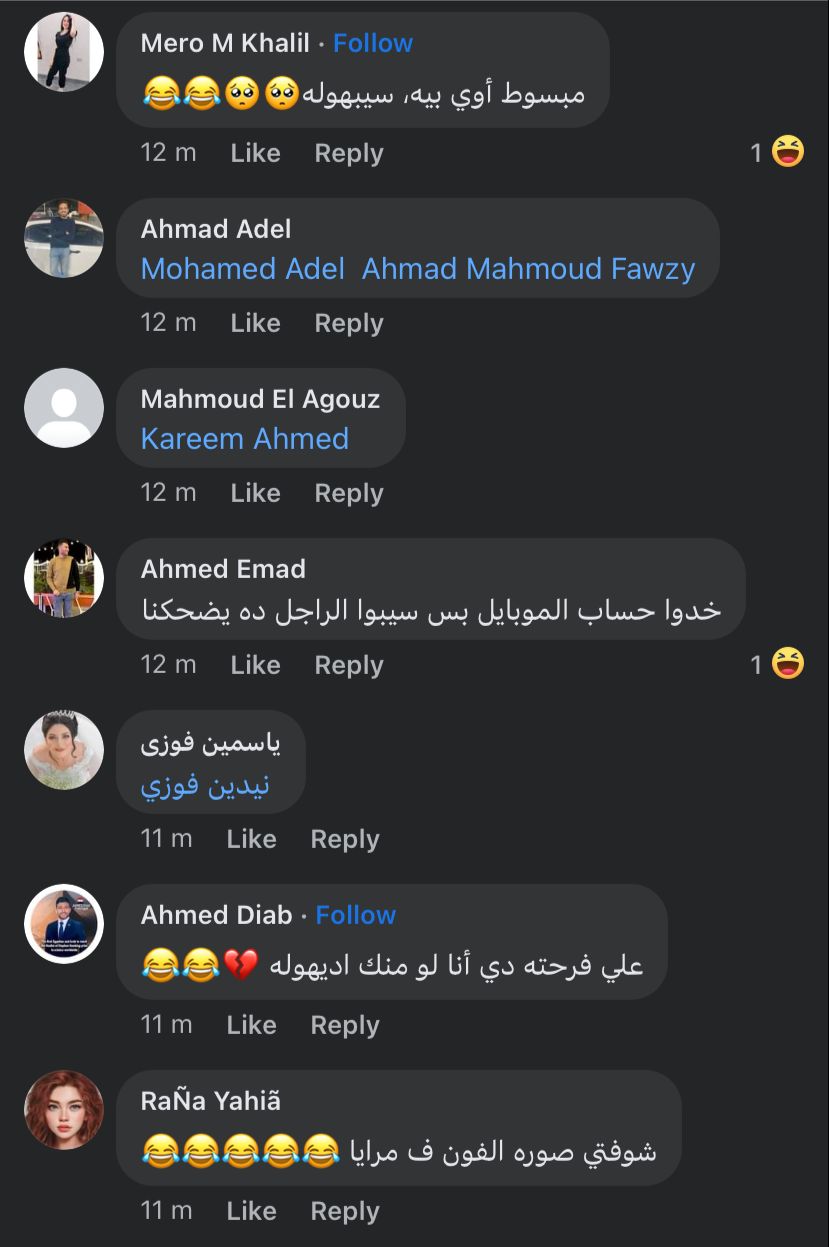وكتب أحمد عماد، في تعليق له على المنشور، خدوا حساب الموبايل بس سيبوا الراجل ده يضحكنا، فيما قال آخر: على فرحته دي أنا لو منك اديهوله، مبسوط أوي به سيبهوله، سيبوه شكله فرحان به.