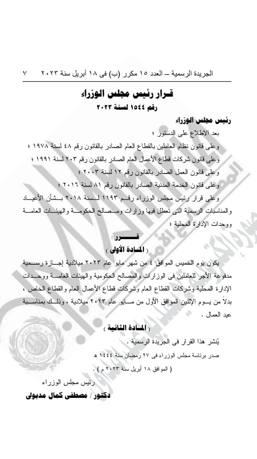 ومن المقرر أن تكون إجازة عيد العمال إجازة مدفوعة الأجر، للقطاعين الحكومي والخاص، وذلك بعد الاطلاع على الدستور، وعلى قانون نظام العاملين بالقطاع العام، الصادر بالقانون رقم 48 لسنة 1978، وقانون شركات قطاع الأعمال العام وقانون العمل القادر بالقانون رقم 12 لسنة 2003 وعلى قانون الخدمة المدنية لسنة 2016.