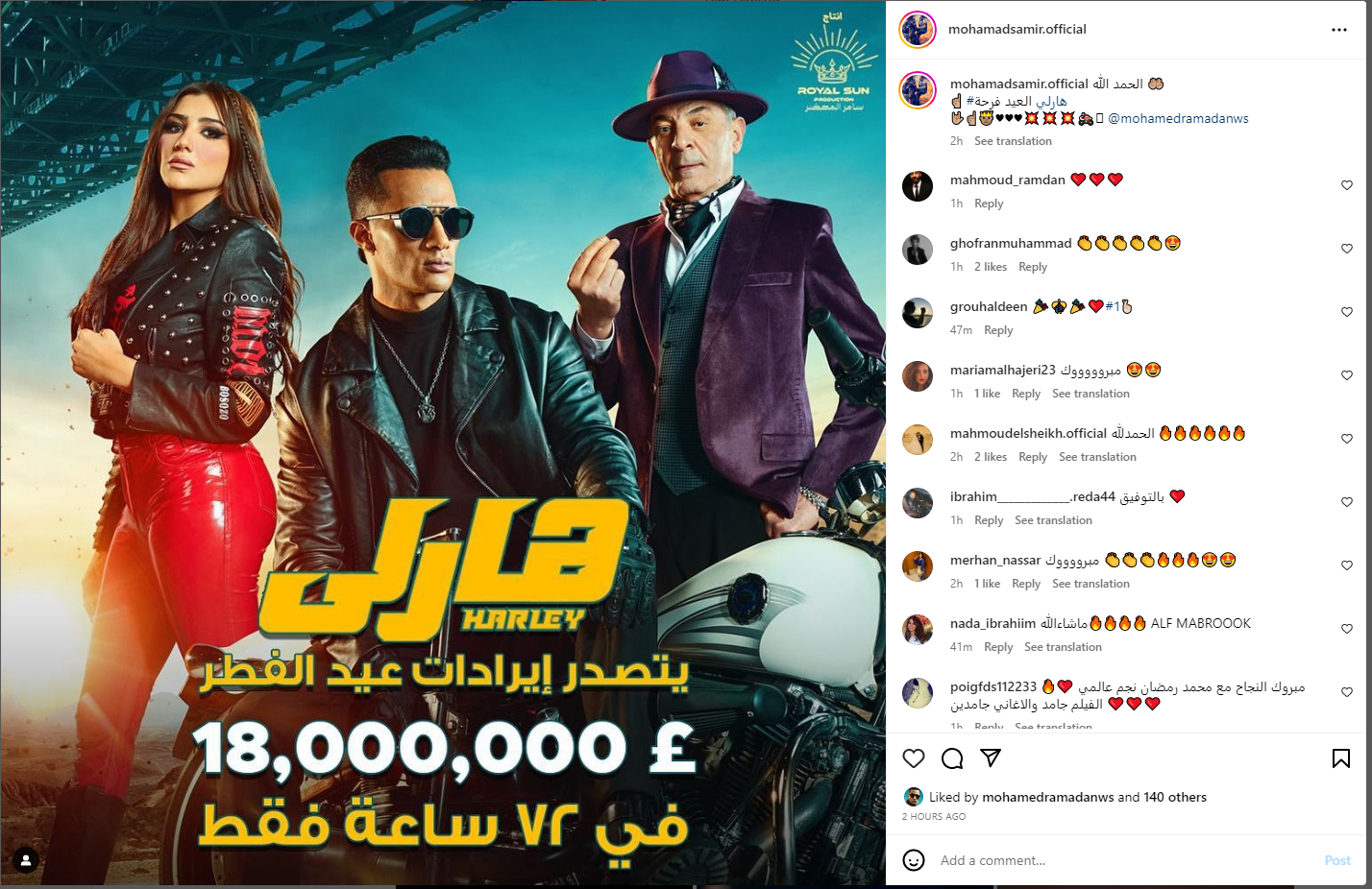 يذكر أن فيلم هارلي حقق نجاحًا ملحوظًا منذ بداية عرضه في السينمات في مصر بالتزامن مع موسم عيد الفطر 2023، إذ نشر المخرج محمد سمير عبر حسابه الشخصي على موقع تبادل الصور والفيديوهات إنستجرام، بوستر فيلم هارلي ويحتوي على إيرادات العمل، وكانت 18 مليون جنيًها مصريًا بعد 3 أيام عرض.