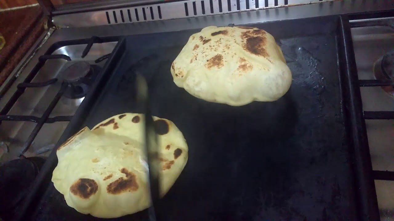 - توضع الطاسة على عين البوتاجاز وتترك لتسخن ثم يسوى فيها أرغفة الخبز واحد تلو الأخر.