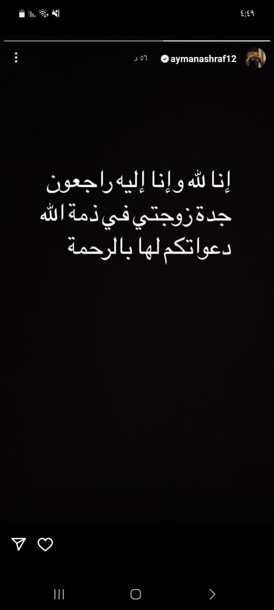 وقال أيمن أشرف عبر حسابه الشخصي على موقع التواصل الاجتماعي إنستجرام: «إنا لله وإن إليه راجعون، جدة زوجتي في ذمة الله دعواتكم لها بالرحمة».