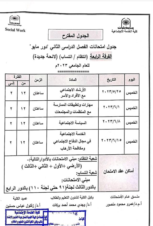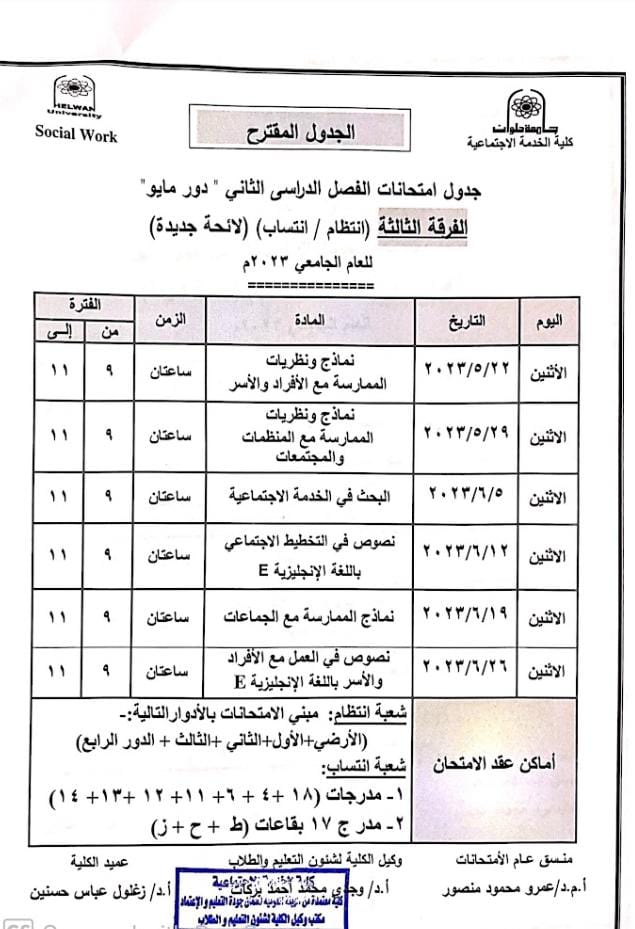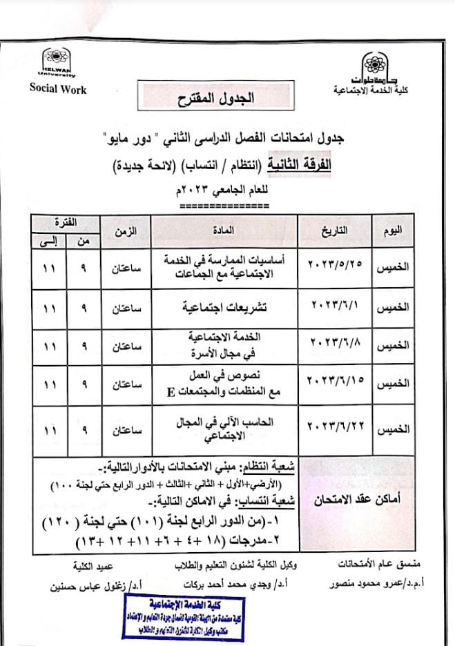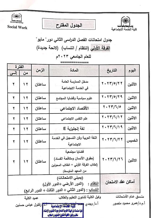 خدمة اجتماعية حلوان تعلن جداول امتحانات الترم الثاني المقترحة 2023 لجميع الفرق الدراسية | صور