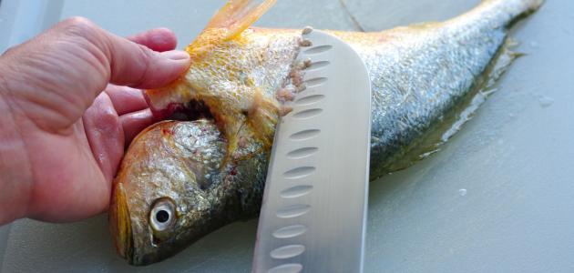 - تقطع رأس السمك وتزال الخياشيم، ثم يتم تمرير السكين بشكل سريع وقوي على جانبي السمك لإزالة القشور.