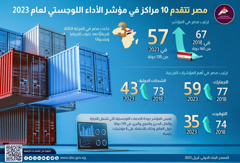 وأوضح مركز المعلومات، أن مصر تتقدم 10 مراكز في مؤشر الأداء اللوجستي لعام 2023، حيث كان ترتيب مصر في 2018 عند 67 من 160 دولة، فيما وصل في 2023 إلى 57 من 139 دولة.