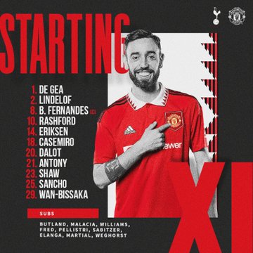 قرر المدرب الهولندي إريك تين هاج، المدير الفني لفريق مانشستر يونايتد، أن يدخل مباراة فريقه لمواجهة نظيره توتنهام هوتسبير في البريميرليج، بتشكيل مكون من:-