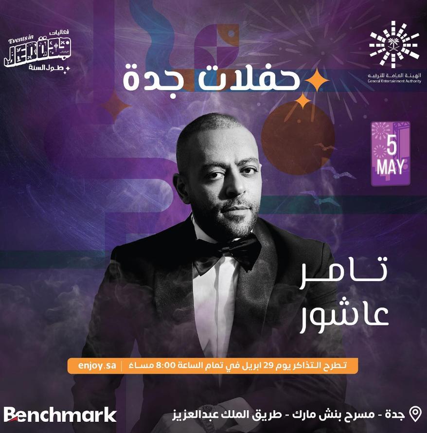يحيي الفنان تامر عاشور حفلًا يوم الجمعة 5 مايو المقبل ضمن حفلات جدة، على مسرح بنش مارك.
