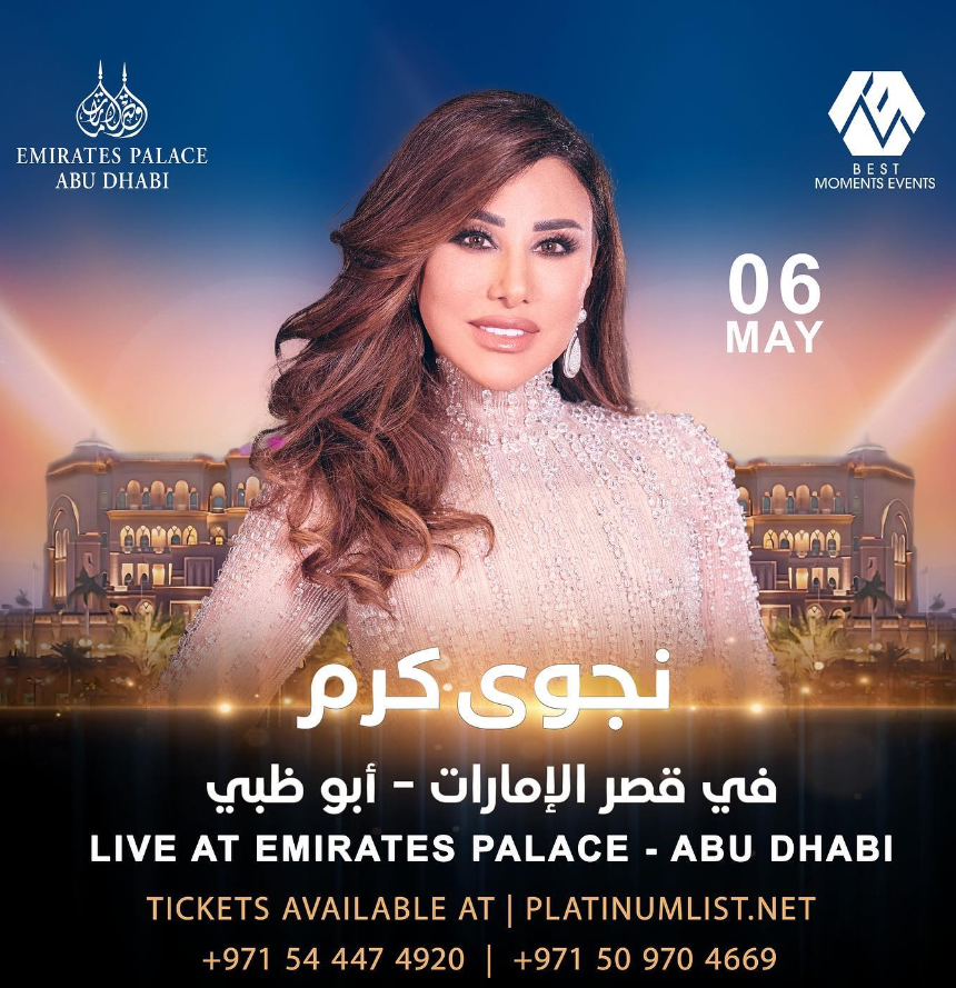 وتزور الفنانة اللبنانية نجوى كرم الإمارات وتحيي حفلًا يوم السبت الموافق 6 مايو المقبل في قصر الإمارات بأبو ظبي.