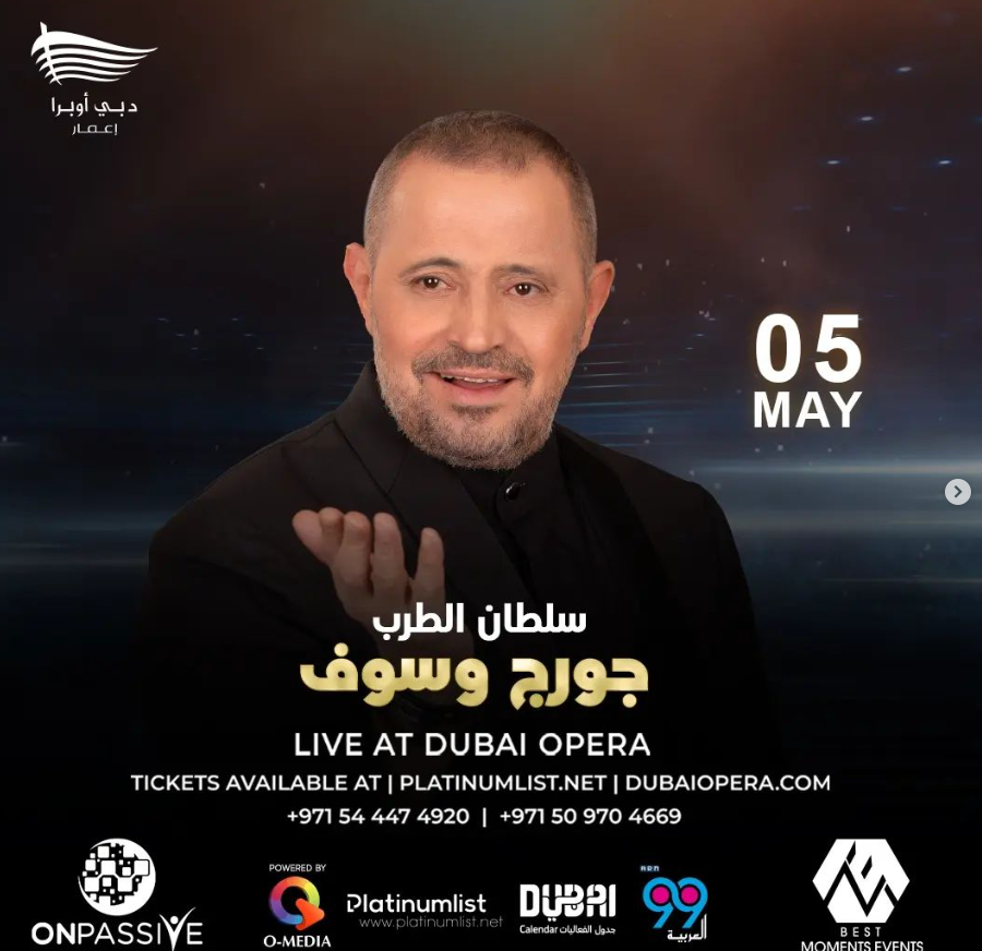 كما يحيي الفنان السوري جورج وسوف يوم الجمعة 5 مايو المقبل حفلًا في دار الأوبرا في دبي، ويصل سعر التذكرة إلى 1850 دينارا إماراتيا أي يعادل 15.565 جنيها.