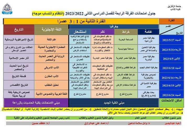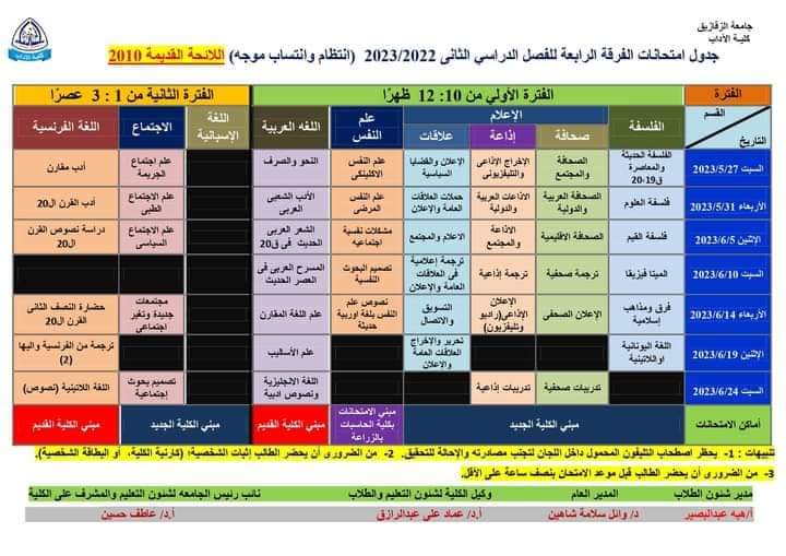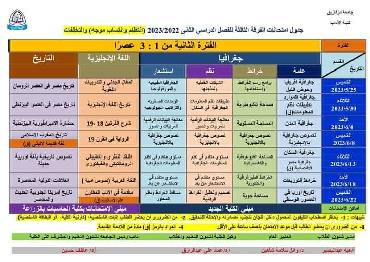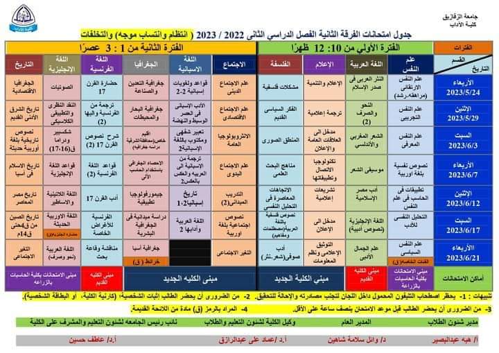 آداب الزقازيق تعلن جداول امتحانات الفصل الدراسي الثاني لجميع الفرق الدراسية | صور