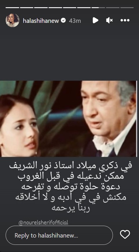ونشرت الفنانة حلا شيحة صورة تجمعها مع الفنان الراحل نور الشريف، خلال خاصية ستوري بحسابها الرسمي بموقع الصور والفيديوهات انستجرام، معلقة: في ذكرى ميلاد الأستاذ نور الشريف ممكن ندعيله قبل الغروب، دعوة حلوة توصله وتفرحه، مكنش فيه في أدبه ولا أخلاقه ربنا يرحمه.
