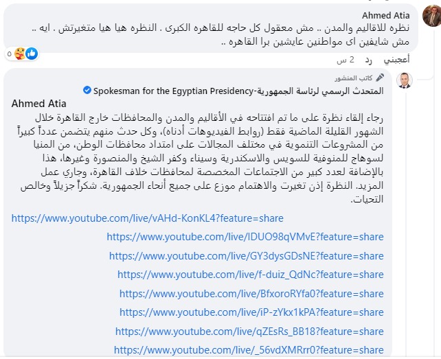 وكتب متحدث الرئاسة: رجاء إلقاء نظرة على ما تم افتتاحه في الأقاليم والمدن والمحافظات خارج القاهرة خلال الشهور القليلة الماضية فقط (روابط الفيديوهات أدناه)، وكل حدث منها يتضمن عددًا كبيرًا من المشروعات التنموية في مختلف المجالات على امتداد محافظات الوطن، من المنيا لسوهاج للمنوفية للسويس والإسكندرية وسيناء وكفر الشيخ والمنصورة وغيرها.