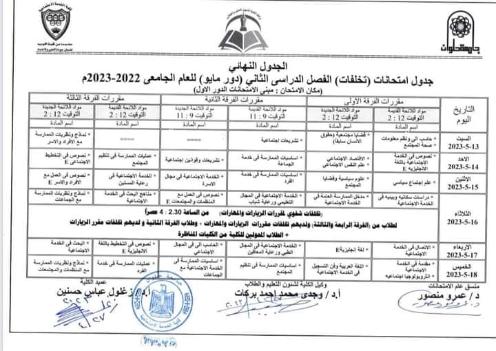 خدمة اجتماعية حلوان تعلن جداول امتحانات التخلفات النهائية لجميع الفرق الدراسية