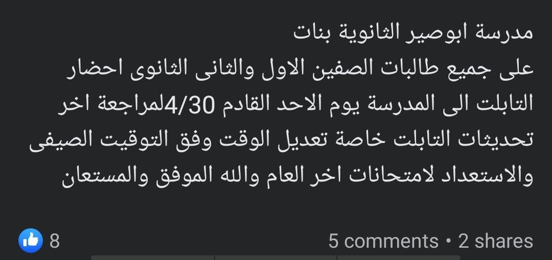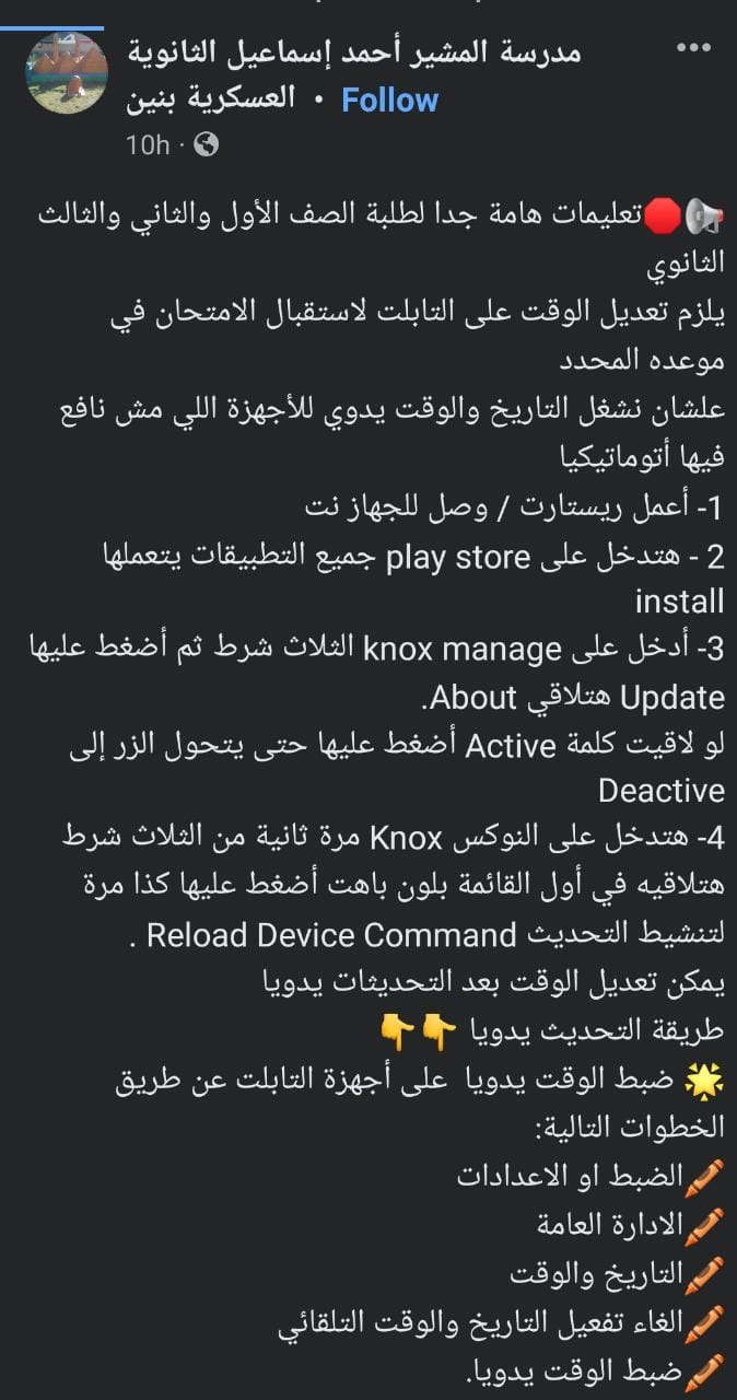 نبهت الكثير من مدارس الثانوية العامة على طلاب الصفين الأول والثاني الثانوي قبل بدء امتحانات الفصل الدراسي الحالي 2022-2023، بضرورة تعديل الوقت على التابلت لـ استقبال الامتحان في موعده المحدد.