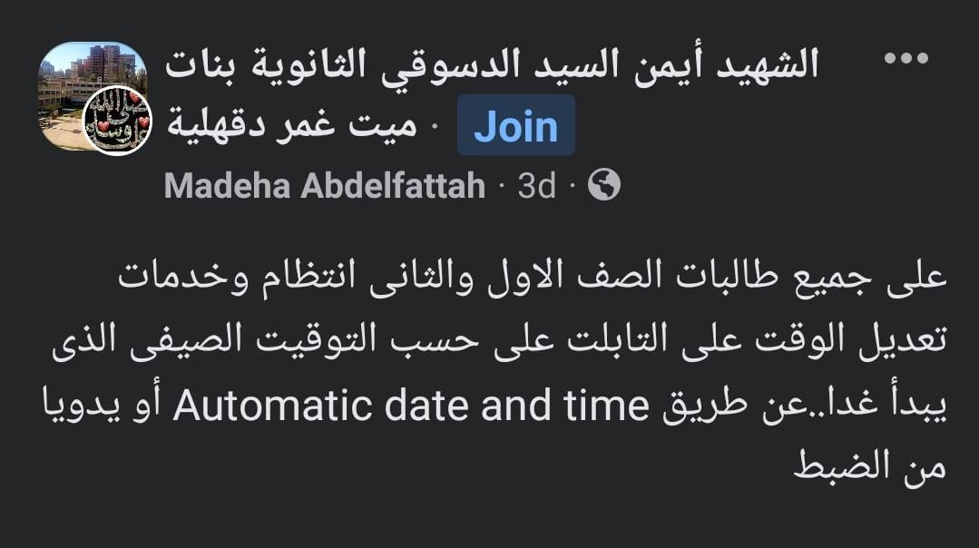 و في وقت سابق، نبهت المديريات التعليمية على أولياء الأمور على تقديم الساعة لمدة 60 دقيقة قبل بدء امتحانات المواد غير المضافة للمجموع، وفقًا لنص القانون رقم 24 لسنة 2023م، مشيرة إلى أنه ستبدأ الامتحانات طبقا للجداول المعلنة طبقا للتوقيت الصيفي.