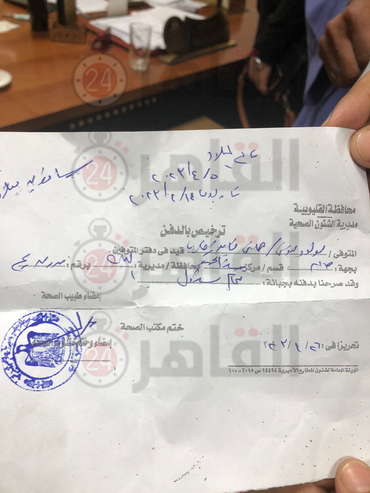 تسليم جثة الرضيعة المتوفاة بمستشفى ناصر بشبرا الخيمة لأهليتها بعد استخراج تصريح الدفن | مستند