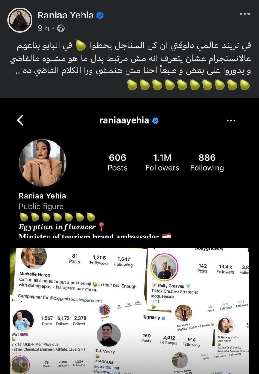 وقالت البلوجر رانيا يحيى، من خلال منشور لها عبر صفحتها الشخصية بتطبيق فيسبوك: فيه تريند عالمي دلوقتي إن كل السناجل يحطوا في البايو بتاعهم على إنستجرام إيموجي الكمثرى عشان يتعرف إنه مش مرتبط بدل ما هو مشبوه على الفاضي، ويدوروا على بعض، وطبعًا إحنا مش هنمشي ورا الكلام الفاضي ده.