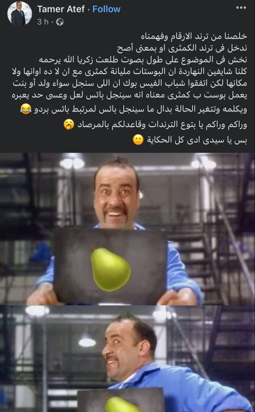 وكتب تامر عاطف: في منشور عبر فيسبوك، خلصنا من تريند الأرقام وفهمناه.. ندخل في تريند الكمثرى أو بمعنى أصح ندخل في الموضوع على طول بصوت طلعت زكريا الله يرحمه، كلنا شايفين النهاردة إن البوستات مليانة كمثرى مع إن لا ده أوانها ولا مكانها لكن اتفقوا شباب الفيسبوك إن اللي سنجل سواء ولد أو بنت يعمل بوست به كمثرى معناه إنه سينجل بائس لعل وعسى حد يعبره ويكلمه وتتغير الحالة بدال ما سينجل بائس لمرتبط بائس بردو، وراكم وراكم يا بتوع الترندات وقاعد لكم بالمرصاد.