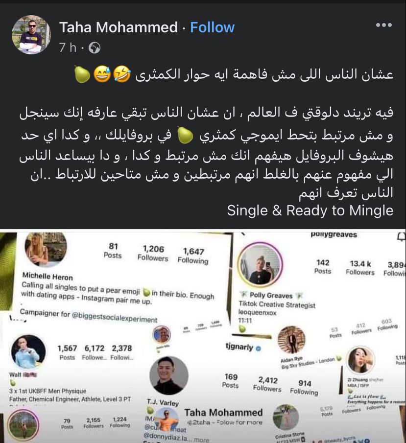 وقال طه محمد: عشان الناس اللي مش فاهمة إيه موضوع الكمثرى، فيه تريند دلوقتي في العالم، إنه عشان الناس تبقى عارفة إنك سينجل ومش مرتبط بتحط إيموجي كمثرى في بروفايلك، وكدا أي حد هيشوف البروفايل هيفهم إنك مش مرتبط وكدا، ودا بيساعد الناس الي مفهوم عنهم بالغلط انهم مرتبطين ومش متاحين للارتباط، إن الناس تعرف إنهم سناجل.