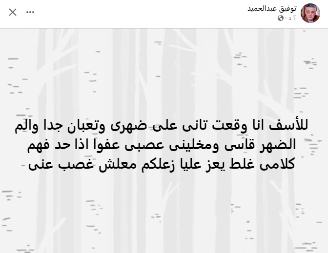 وكتب توفيق عبد الحميد منشورًا، عبر حسابه الشخصي بموقع التواصل الاجتماعي فيس بوك، قال فيه: للأسف أنا وقعت تاني على ضهري، وتعبان جدًا، وألم الظهر قاسي مخليني عصبي، عفوا إذا حد فهم كلامي غلط يعز عليّا زعلكم.. معلش غصب عني.