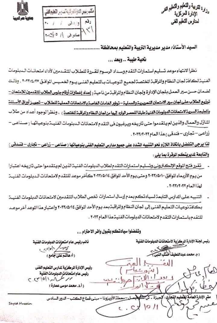 جاء ذلك نظرًا لانتهاء موعد تسليم استمارات التقدم وسداد الرسوم المقررة للطلاب المتقدمين لأداء امتحانات الدبلومات الفنية، لكافة لجان النظام والمراقبة المختصة لجميع النوعيات بالتعليم الفني يوم الخميس الموافق 27 إبريل 2023.