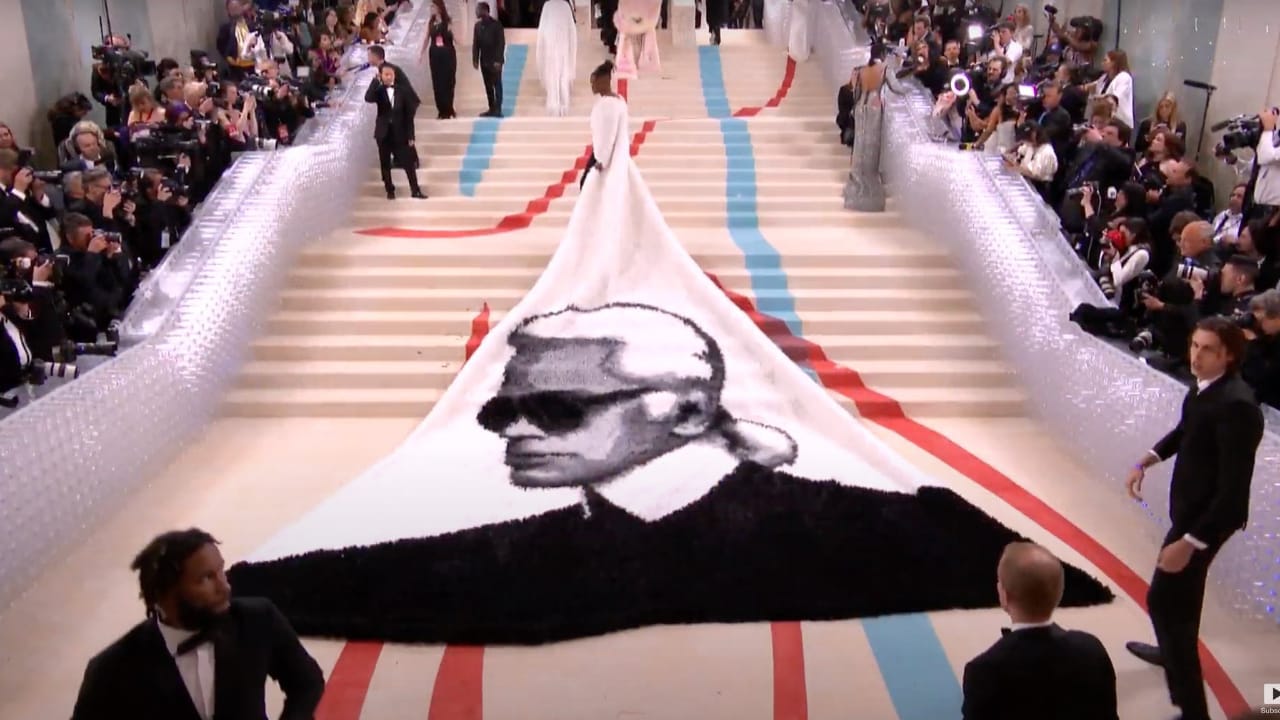 وارتدى الفنان الأمريكي جيريمي بوب، بنطال بستايل الشارلستون، وسترة ذات ذيل طويل للغاية (Bolmain) ورُسم عليها صورة مصمم الأزياء كارل لاغرفيلد بالتزامن مع تكريمه في حفل Met Gala 2023.