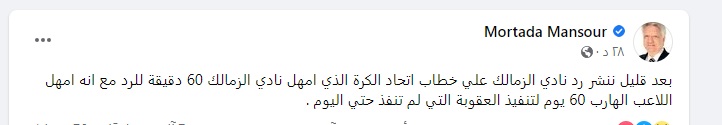ورد مرتضى منصور على خطاب اتحاد الكرة بإعطاء النادي مهلة 60 دقيقة لحسم مشاركته في اللقاء، وأكد مرتضى منصور على عدم مشاركته في مباراة السوبر المصري، وجاءت تفاصيل بيان رئيس نادي الزمالك كالآتي: