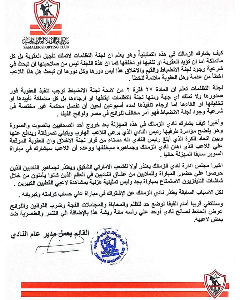وذكر بيان مجلس إدارة الزمالك، بأن الفريق لم يشارك في مباراة السوبر بسبب القرارات المتعنتة والمستمرة من اتحاد الكرة بداية من أزمة قيد الصفقات الشتوية وحرمان الفريق من مجهودات اللاعبين الجدد وصولا إلى ازمة إيقاف اللاعب محمد عبد المنعم كهربا، كما وجة مترضى منصور الاعتذار للعشب الإماراتي ومجلس أبوظبي الرياضي، والمنظمين وجماهر الزمالك والأهلي التي قامت بحجز تذاكر اللقاء، مؤكدًا أن هذا القرار جاء حفاظًا على حقوق النادي.