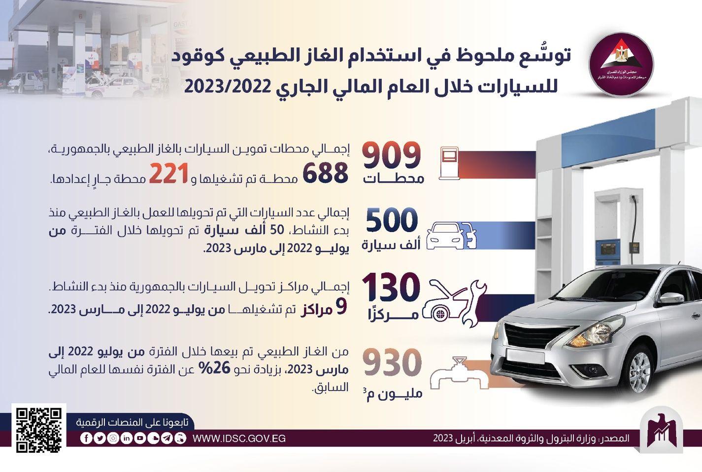 وأوضح مركزالمعلومات في انفوجراف نشره عبر صفحتة الرسمية على موقع التواصل الاجتماعي، أن 500 ألف سيارة تم تحويلها للعمل بالغاز الطبيعي حتى الآن يخدمها نحو 909 محطة تموين غاز طبيعي؛ 688 محطة منها تم تشغيلها بالفعل وجار إعداد 221 محطة.