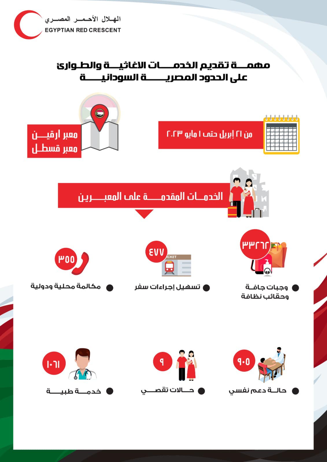 وقالت جمعية الهلال الأحمر المصري، في منشور لها عبر صفحتها الرسمية بموقع التواصل الاجتماعي فيس بوك، إن متطوعي الهلال الأحمر المصري، قدموا حتى الآن نحو 33262 وجبة جافة وحقائب نظافة، منذ 21 أبريل حتى 1 مايو 2023، علاوة على تسهيل إجراءات السفر لـ 477 مستفيدا، وإجراء 355 مكالمة محلية ودولية للعائدين من الأراضي السودانية، بجانب تقديم الدعم النفسي لنحو 905 حالات، ونحو 1061 حصلوا على الخدمات الطبية في معبري أرقين وقسطل.