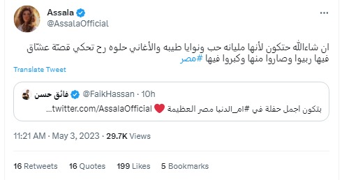 وأعادت أصالة نشر تغريدة، كتبها زوجها فايق حسن، داعما إياها، عبر حسابه الرسمي بموقع تويتر، وعلقت: إن شاء الله هتكون حفلة جميلة لأنها مليانة حب ونوايا طيبة، والأغاني حلوة رح تحكي قصة عشاق فيها ربيوا وصاروا منها وكبروا فيها، كما فعلت هاشتاج مصر.