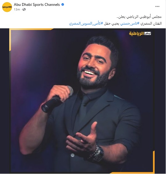 يحيي الفنان تامر حسني، حفل كأس السوبر المصري، الذي يجمع بين فريقي الأهلي وبيراميدز، مساء بعد غد الجمعة على ملعب محمد بن زايد بالإمارات.