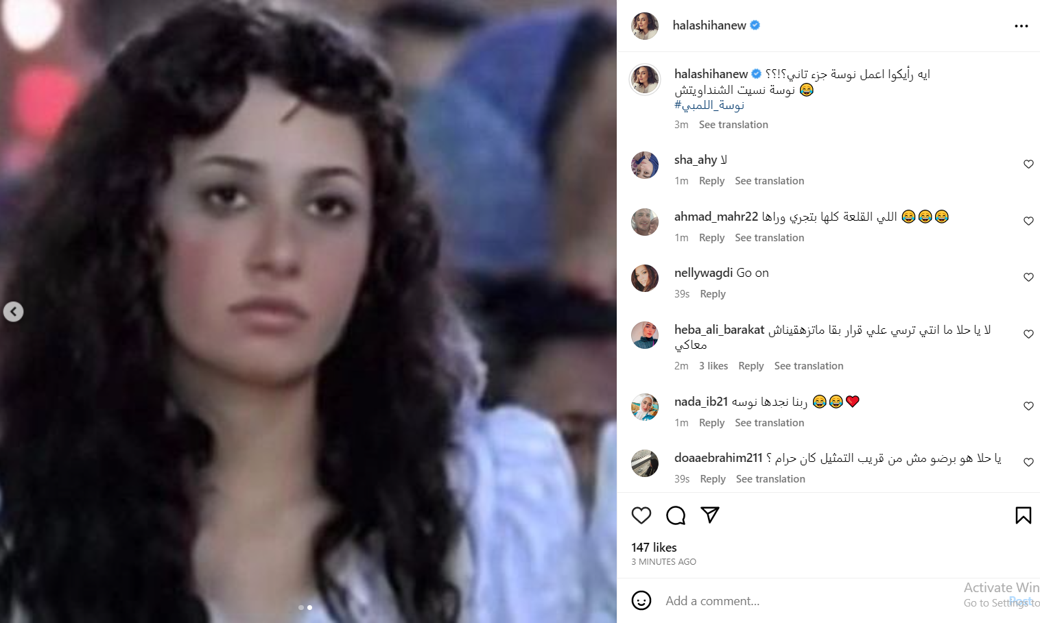 وجاءت بعض التعليقات كالآتي: يا حلا هو برضو مش من قريب التمثيل كان حرام؟ - ياريت والله بس لازم يكون بنفس روح الجزء الأول وتكون معاكم أستاذة عبلة - أنت تقدري تعملي أي حاجة وكل حاجة انتي عاوزاها المهم قمرنا يفضل معانا طول العمر يا أجمل نوسة في الكون يلي مصر الجديدة كلها بتجري وراكي.