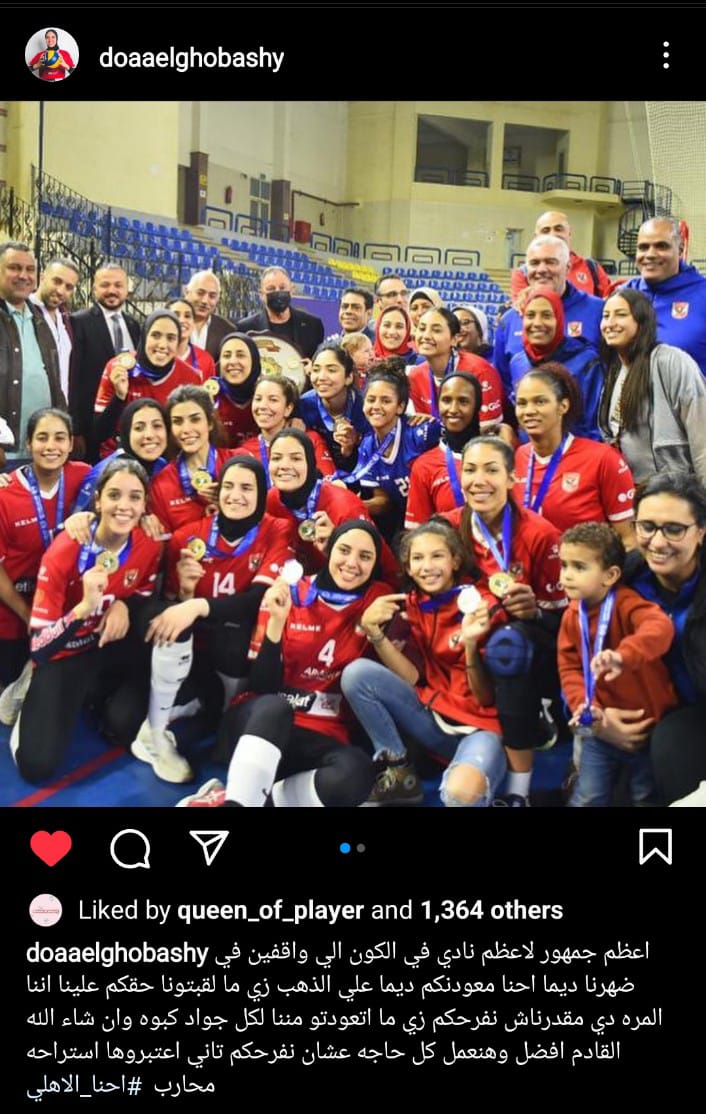 قالت دعاء الغباشي لاعبة الفريق الطائرة في النادي الأهلي، “أعظم جمهور لأعظم نادي في الكون اللي واقفين في ضهرنا ديما إحنا معودنكم ديما على الذهب زي ما لقبتونا”.