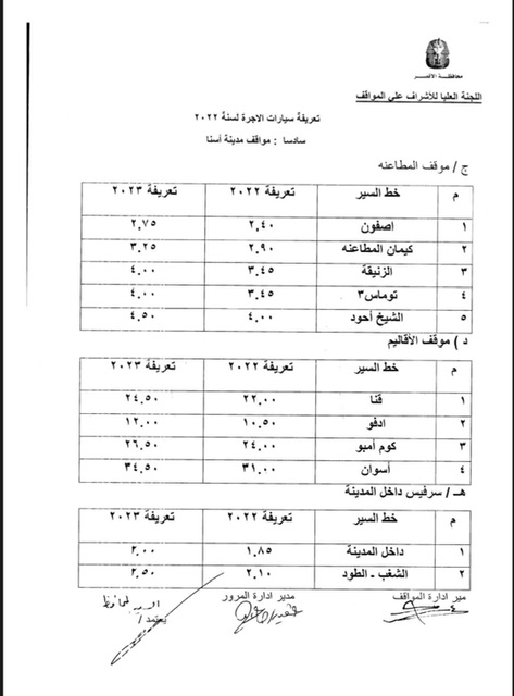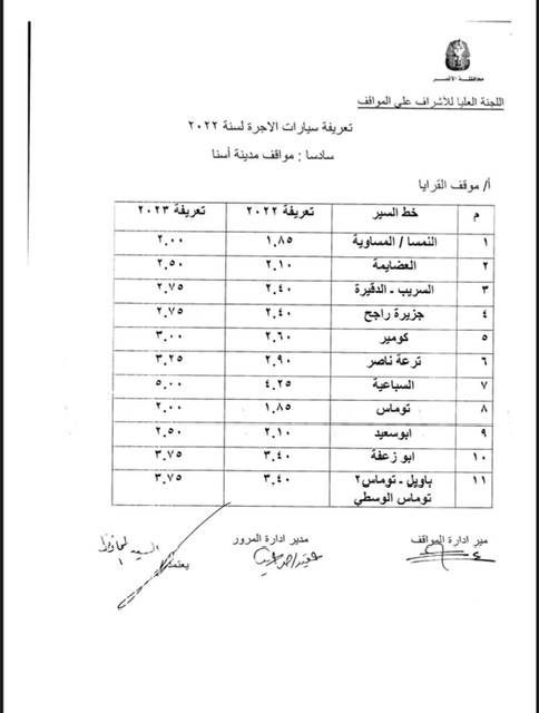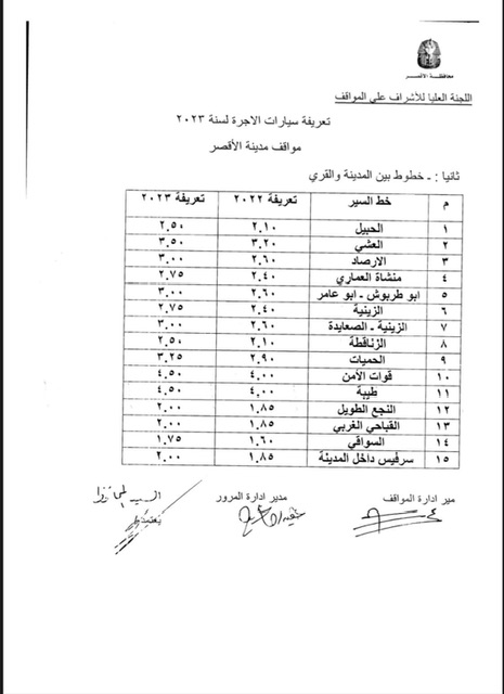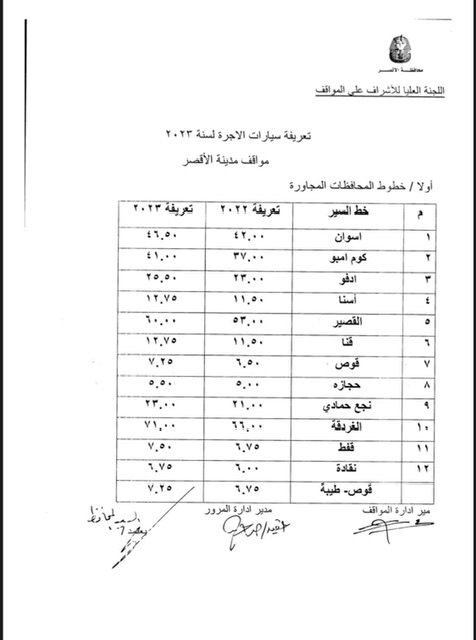 أعلنت اللجنة العليا للإشراف على المواقف إعتماد التعريفة الجديدة لسيارات الاجرة لمحافظة الأقصر لسنة 2023 بعد قرار لجنة التسعير التلقائي للمنتجات البترولية بتحريك أسعار السولار جنيها إضافيا لأول مرة منذ أكثر من عام.