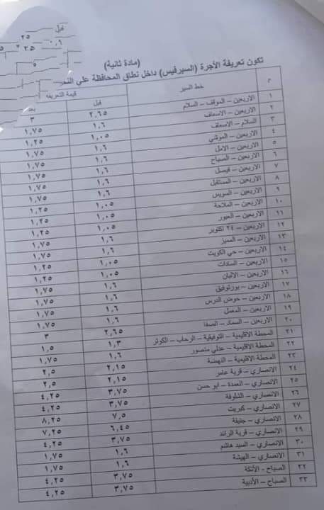 وقرر محافظ السويس رفع أجرة خط السويس المرج إلى 31.25 جنيه والسويس إلى المنيب 38.25 جنيه، والسويس إلى الإسماعيلية 25 جنيهًا، والسويس إلى بورسعيد 52 جنيهصا، والسويس إلى الزقازيق 48.75 جنيه، والسويس إلى المنصورة 60 جنيها.