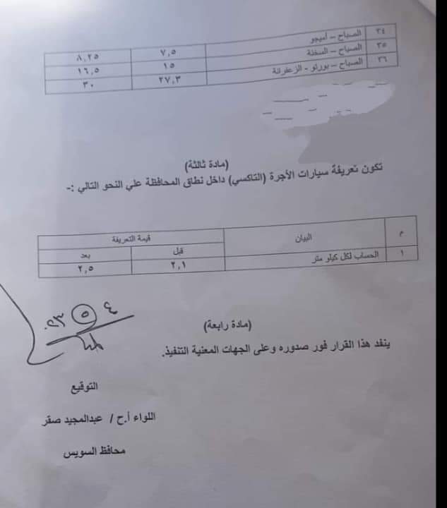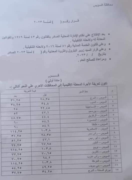 كما قرر أن تكون أجرة السويس إلى طنطا 60 جنيهًا، والسويس إلى الإسكندرية 114.25 جنيه، والسويس إلى رأس سدر 31.25 جنيه، والسويس إلي أبورديس 51.75 جنيه، والسويس إلى الطور 74.25 جنيه، والسويس إلى نويبع 114.25 جنيه، والسويس إلى كاترين 77.75 جنيه، والسويس إلى رأس غارب 70.75 جنيه، والسويس إلى الغردقة 114.25 جنيه، والسويس إلى بني سويف 54.25 جنيه، وبورتو السخنه إلى المرج 37 جنيها و75 قرشا.