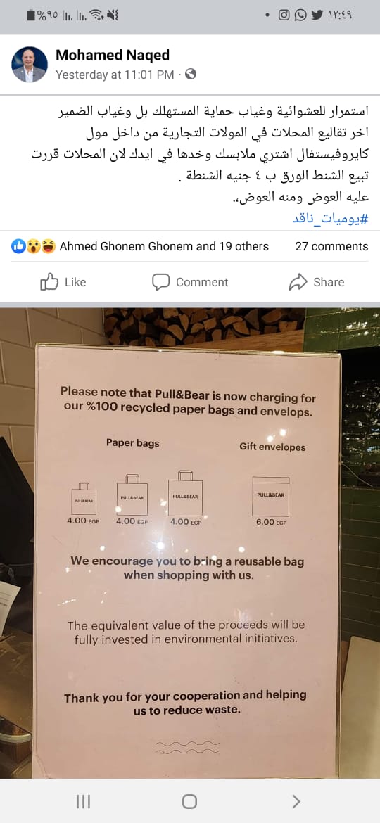 وقال الإعلامي محمد ناقد، لـ القاهرة 24، إنه ذهب أمس لشراء ملابس وصلت قيمتها إلى 1200 جنيه من متجر Pull&Bear داخل مول كايرو فيستيفال، وبعد دفع ثمن مشترياته علم بضرورة دفع مبلغ 4 جنيهات لشراء حقيبة ورقية لوضع الملابس بداخلها.