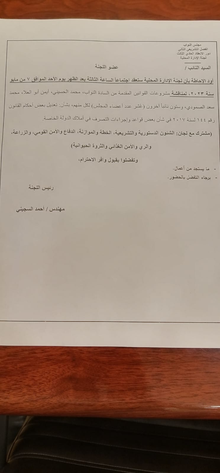 تعقد لجنة الإدارة المحلية في مجلس النواب، برئاسة النائب أحمد السجيني، اجتماعًا يوم الأحد المقبل، لمناقشة مشروعات القوانين المقدمة من النواب محمد الحسيني، أيمن أبو العلاء محمد بعد الصمودي، وستون نائبا آخرون، عشر أعضاء المجلس، بشأن تعديل بعض أحكام القانون رقم 144 لسنة 2017 في بعض قواعد وإجراءات التصرف في أملاك الدولة الخاصة.