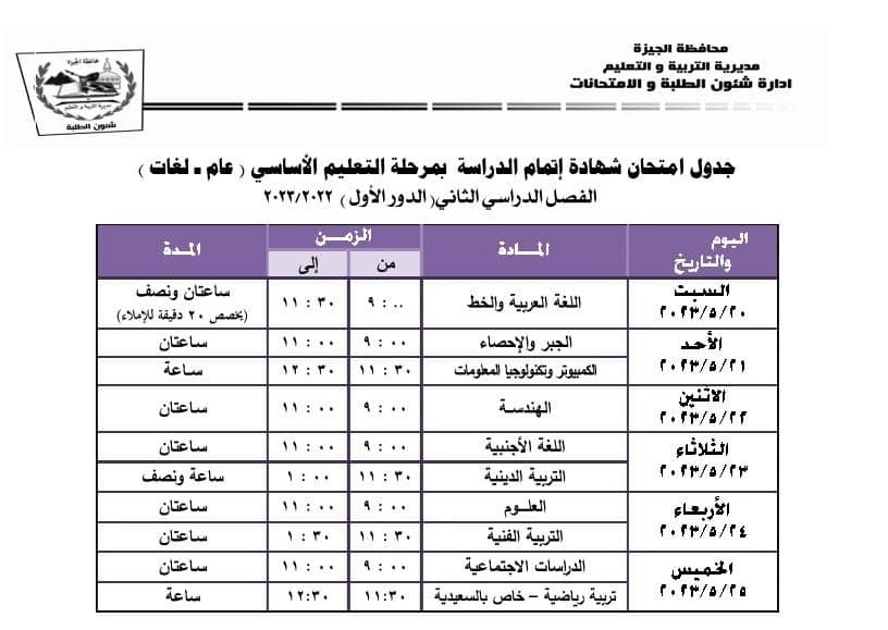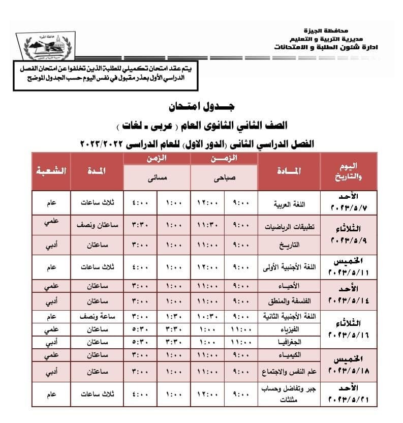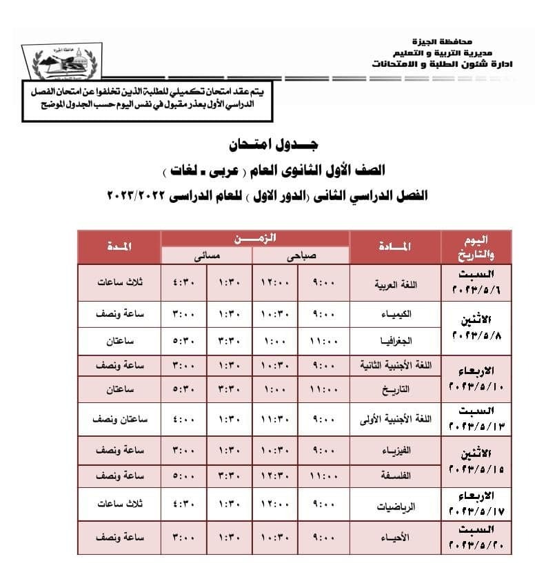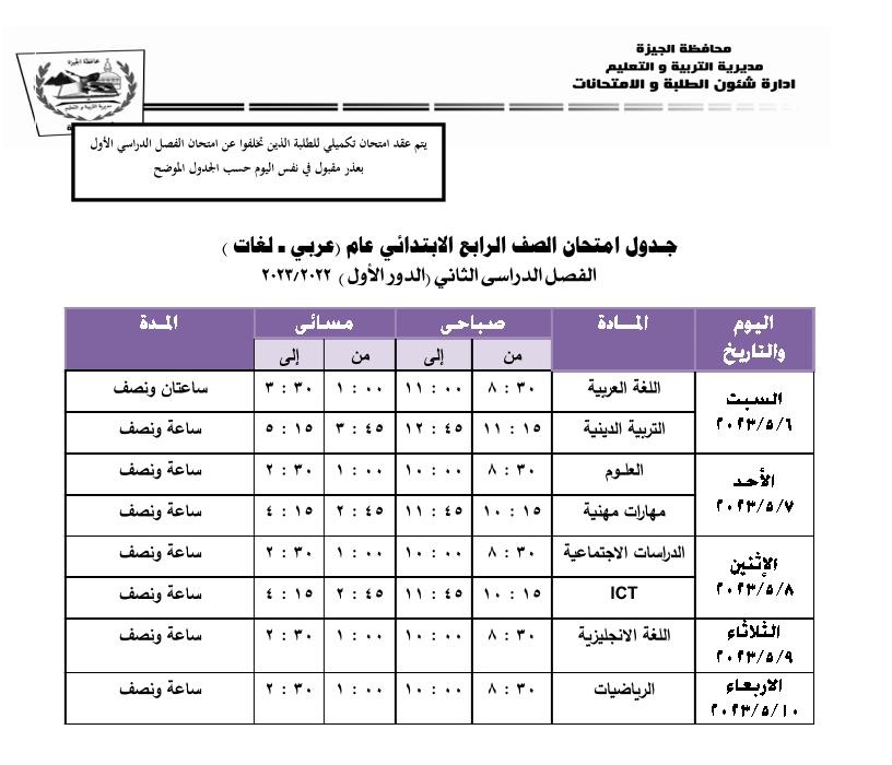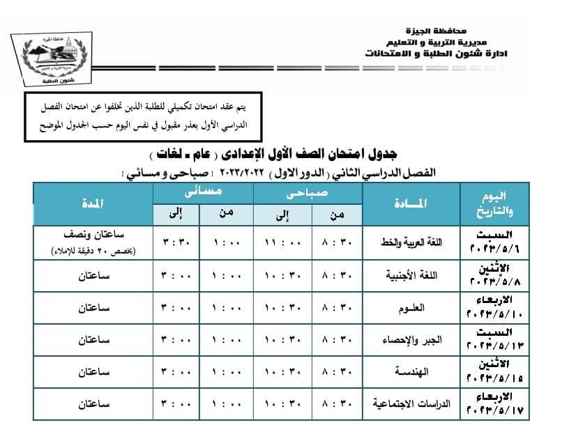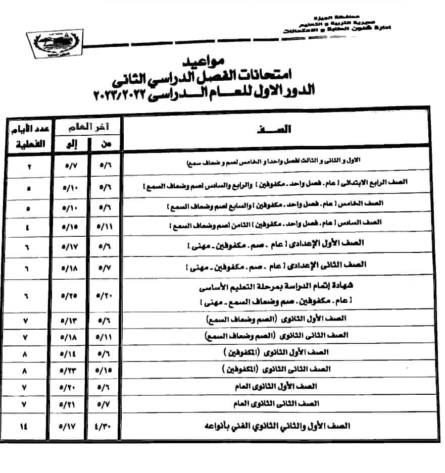 جداول امتحانات الفصل الدراسي الثاني بالجيزة