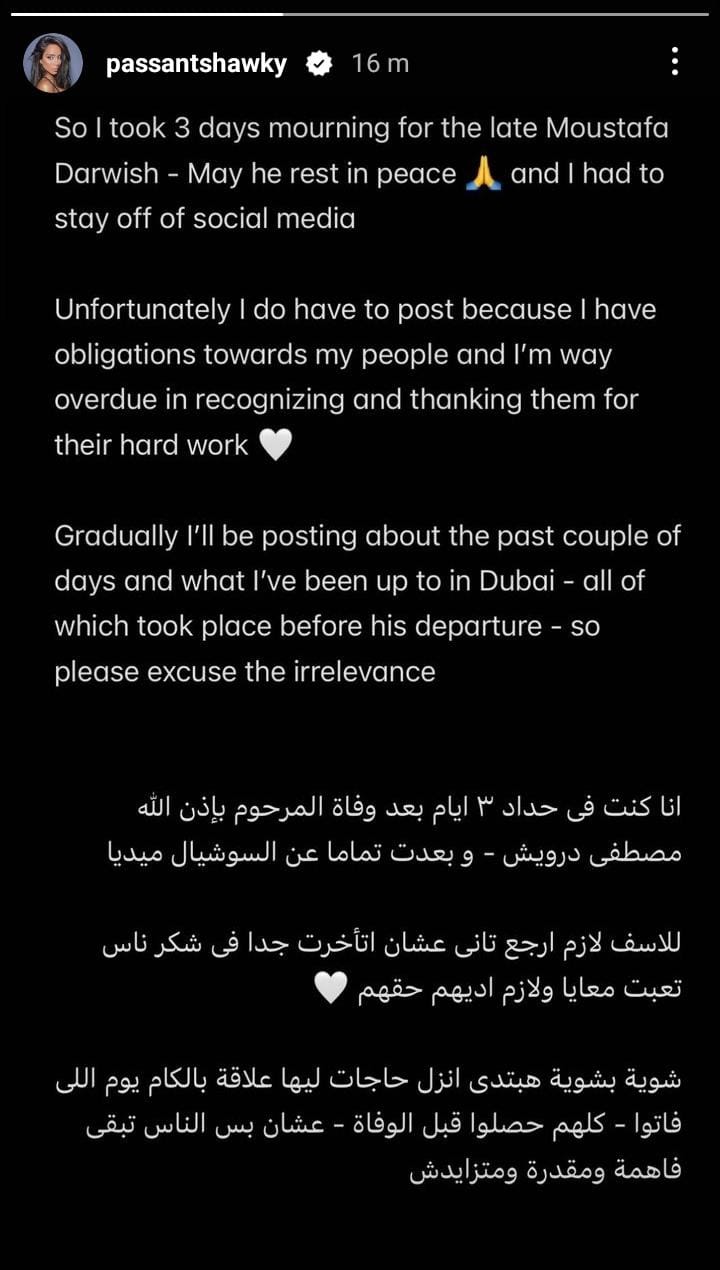 وكتبت بسنت شوقي ستوري، عبر حسابها الرسمي بموقع فيس بوك، مشيرة إلى أنها كانت في فترة حداد بعد وفاة مصطفى درويش، وعلقت: أنا كنت في حداد 3 أيام بعد وفاة المرحوم بإذن الله مصطفى درويش، وبعدت تماما عن السوشيال ميديا، بس للأسف لازم أرجع تاني عشان اتأخرت جدا في شكر ناس تعبت معايا ولازم أديهم حقهم.