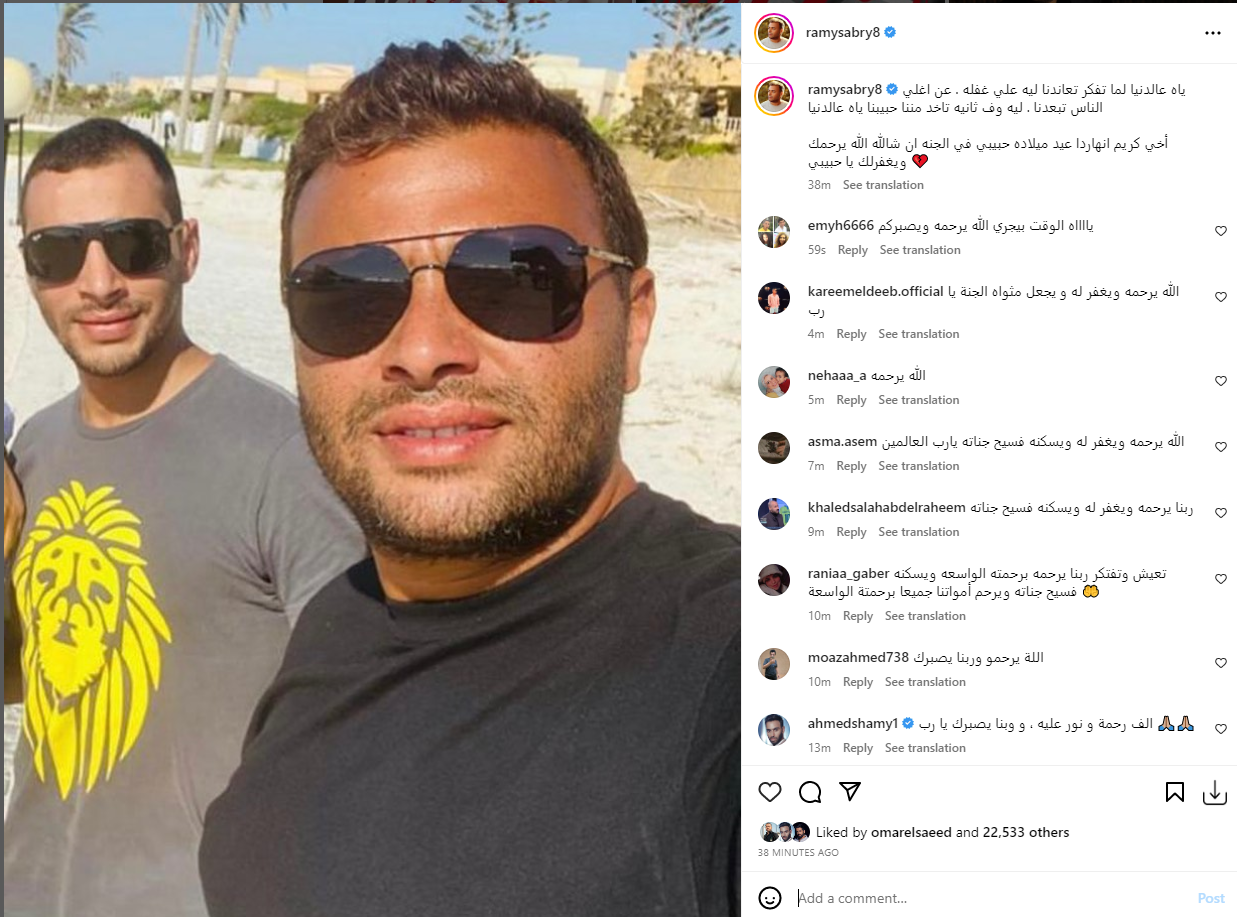 أحيا الفنان رامي صبري ذكرى ميلاد شقيقه الأصغر الفنان كريم صبري، الذي رحل عن عالمنا في شهر يوليو 2021 في حادث مروع حيث مات غرقًا في ترعة المريوطية.