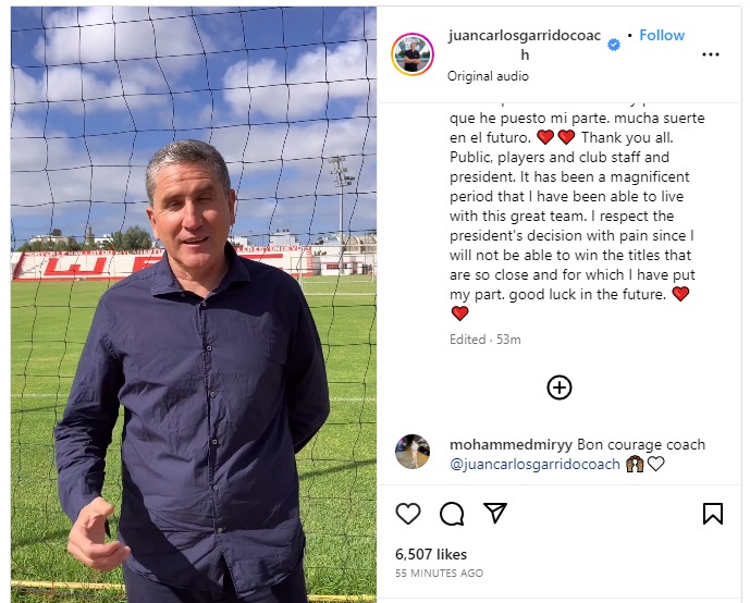 أعلن المدرب الإسباني خوان كارلوس جاريدو، اليوم الجمعة، رحيله عن نادي الوداد البيضاوي المغربي.