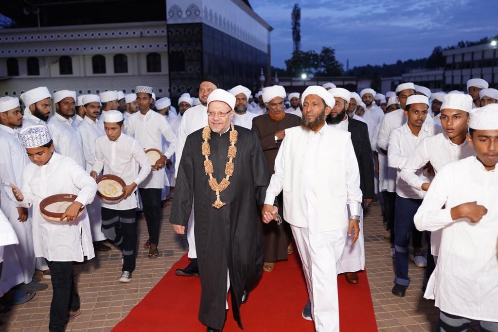 وأضاف فضيلته خلال لقائه بطلاب جامعة الثقافة الإسلامية في ولاية كيرالا الهندية، أن العلماء هم ورثة الأنبياء وحملة الرسالة ومجددو الملة، بهم يُقتدى في ظلمات الليل البهيم، وبأنوارهم يُهتدى إلى صراط الله المستقيم، وبإرشادهم تكون النجاة من حالك الفتن وظلام الشبهات، ومن هؤلاء الأئمة الأعلام والهداة التقاة الإمام الجليل الشافعي الذي نشر العلم في كل أرجاء الدنيا إلى أن استقر به المقام في مصر الكنانة.